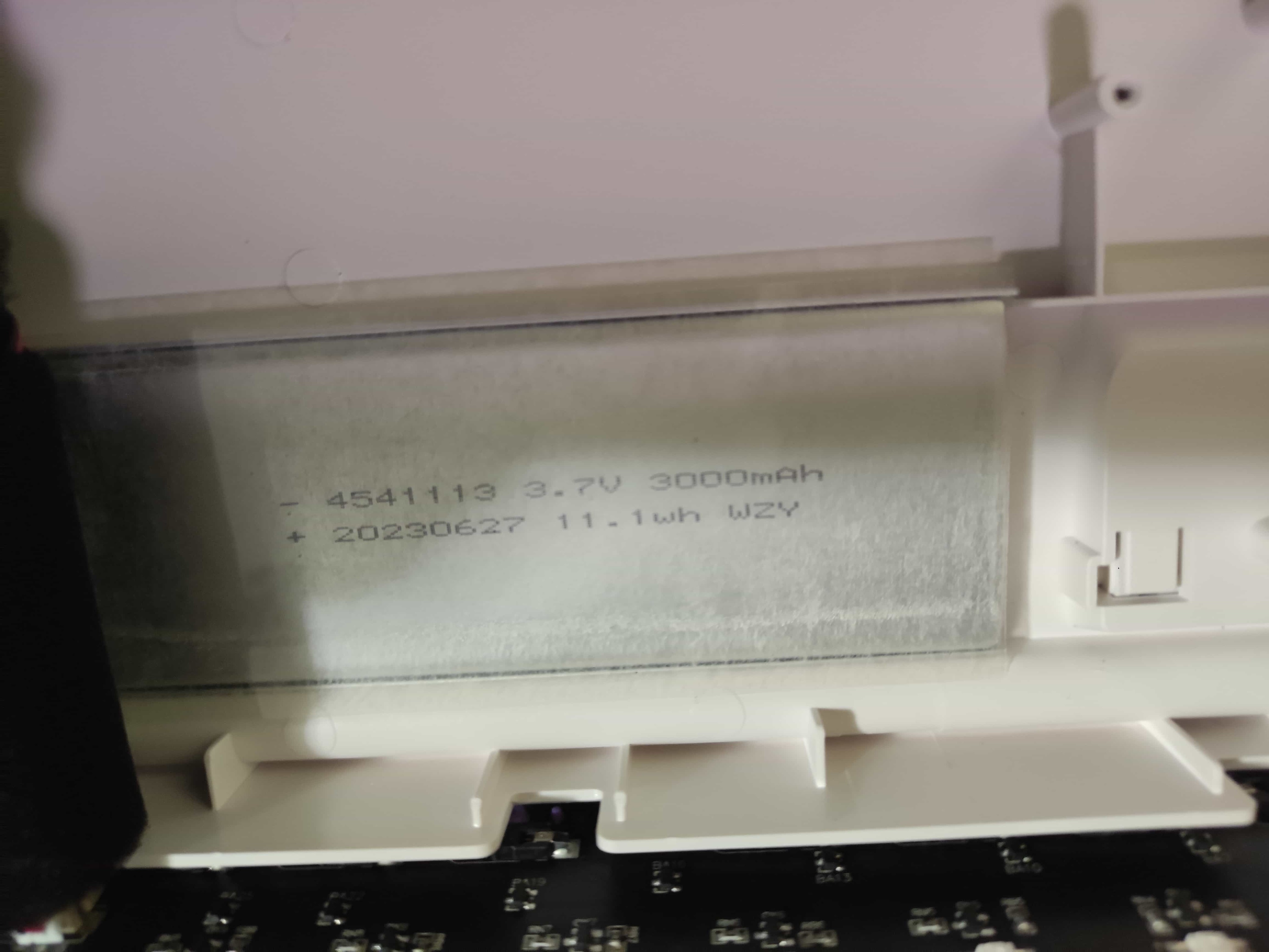 電池則是一塊3000mAh容量的電池,位於消音底棉的下方,拆開的時候注意,下方有兩個接線需要拔掉,一個是USB連接線、一個電池的連接線。