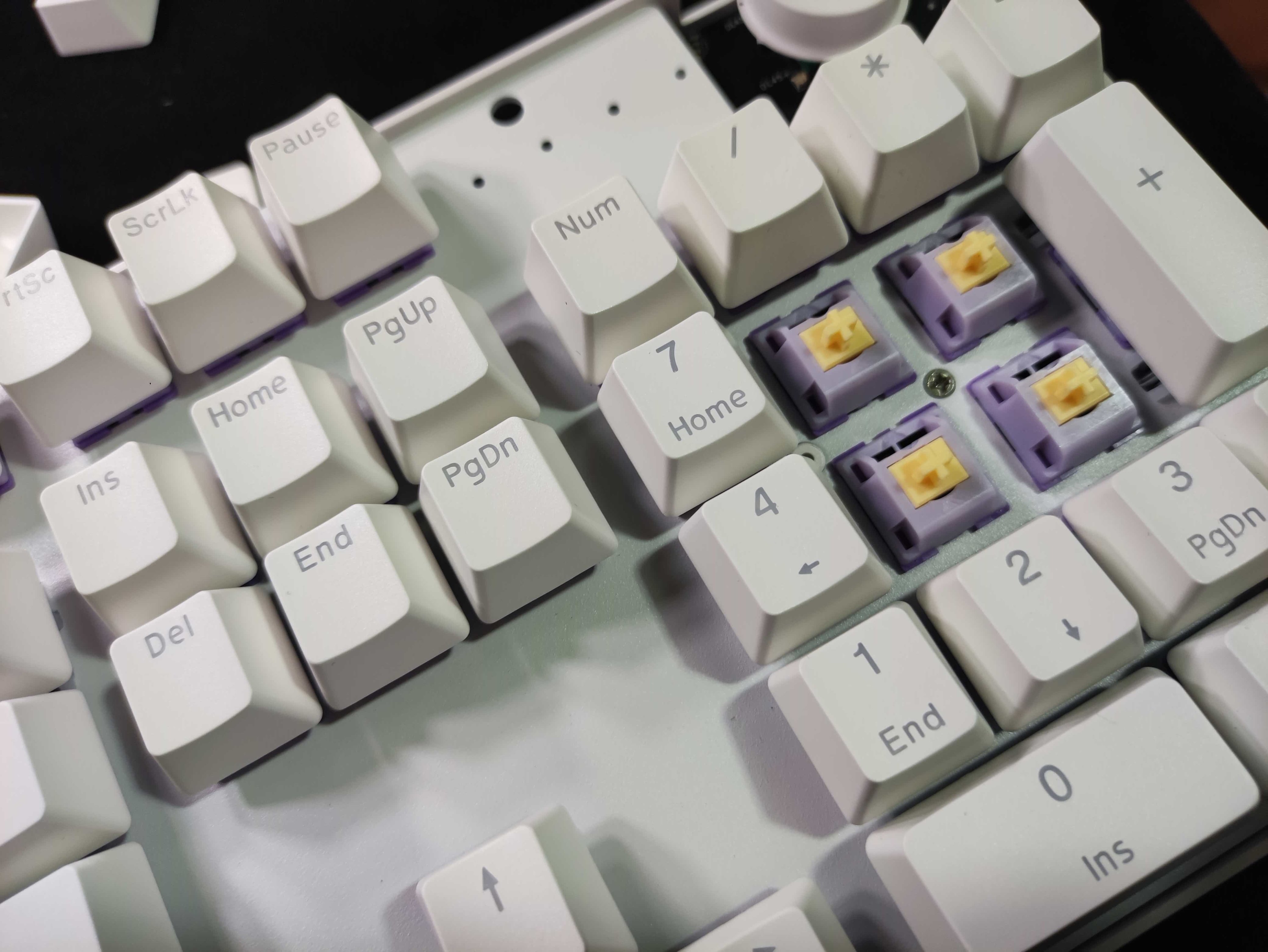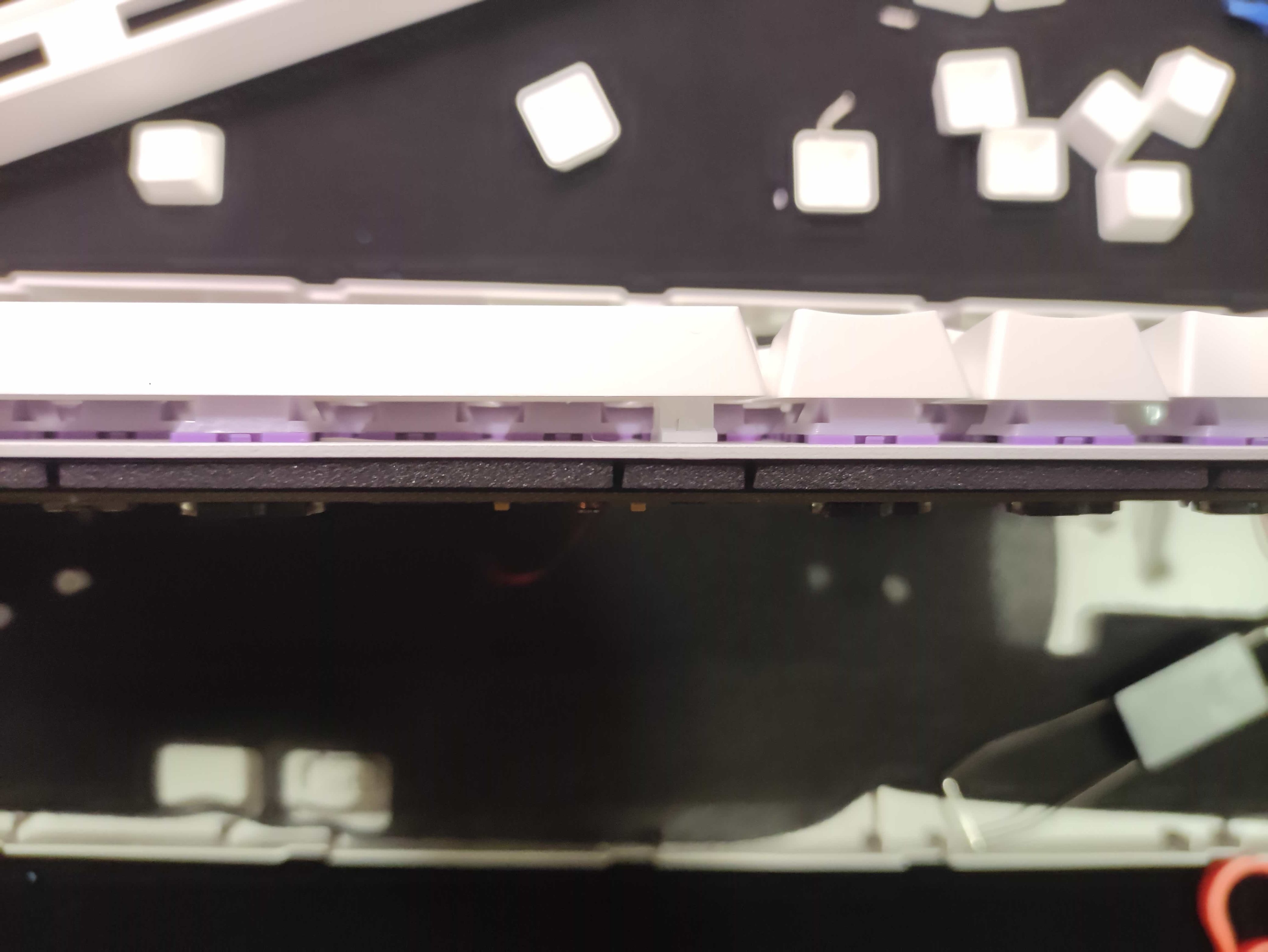 鍵盤是較爲典型的船殼結構,一個白色的鋼的定位板,下面是一個黑色的EVA夾心棉以及一個軸下墊。