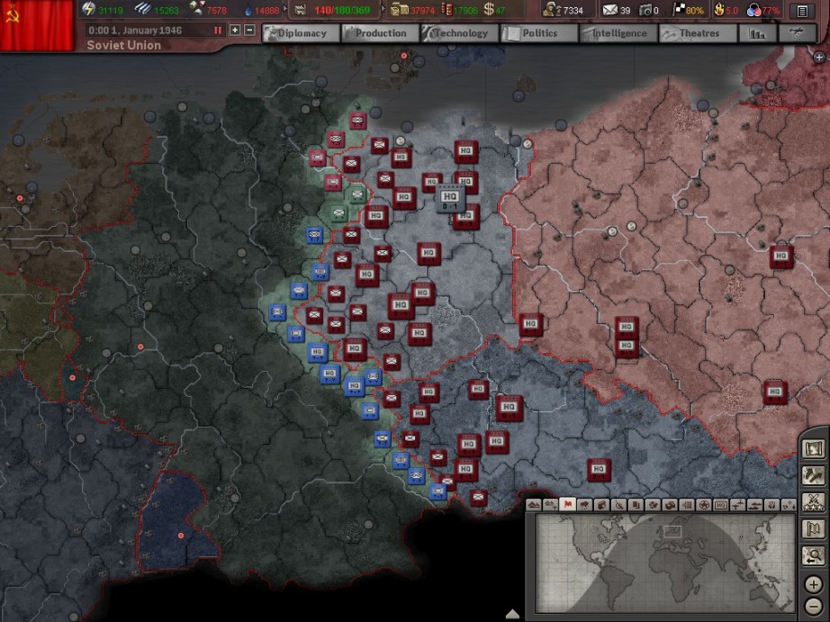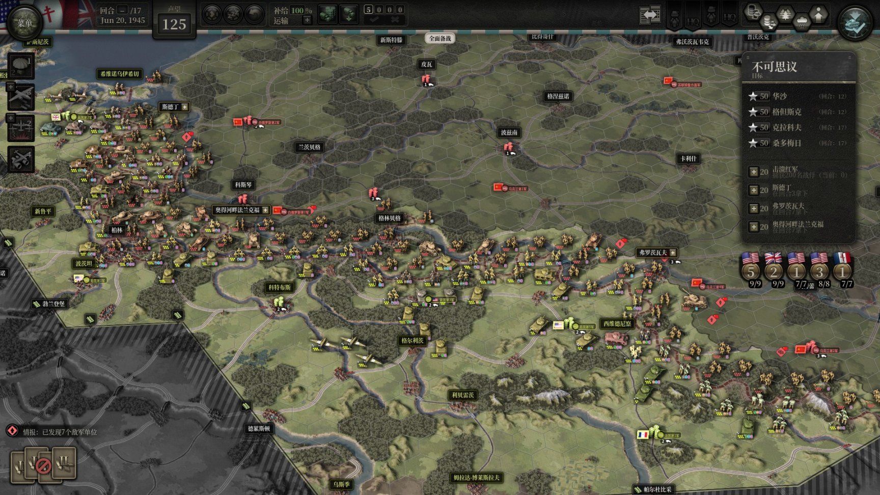 以上是大战略游戏钢铁雄心三中的战役剧本:不可思议行动。这个剧本是46年1月1日开始的,西方盟军在前线上的兵力差不多是80个师,算上后备军100个师(包括重新动员的前德三国防军)。