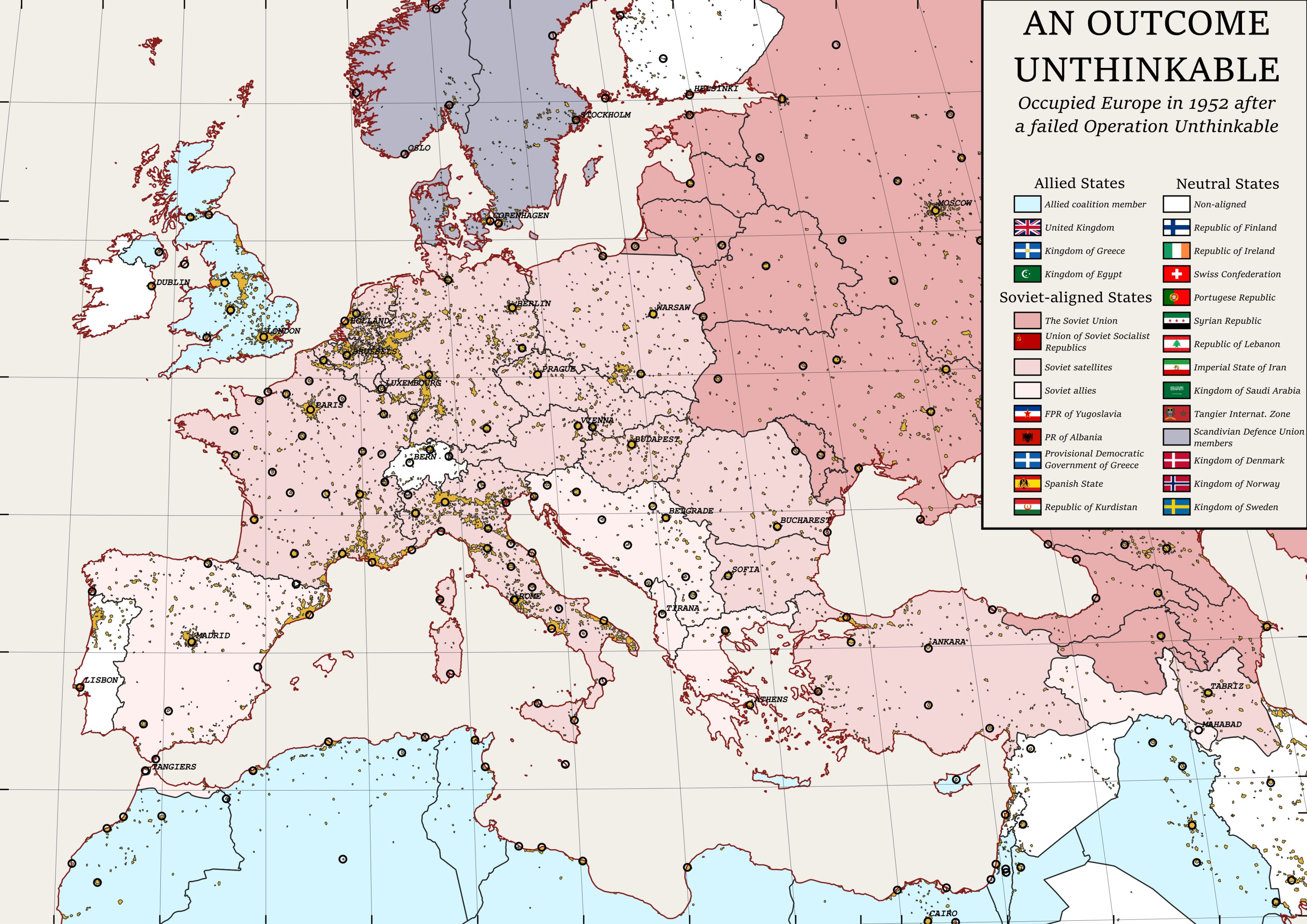 在以上这个假想的不可思议行动失败的欧洲地图里,德国法国意大利土耳其都变成了苏联卫星国,西班牙和希腊成了苏联盟友。丹麦挪威瑞典保持中立,结成了斯堪的纳维亚防御联盟。盟国靠着制海权还控制着北非和英伦三岛。