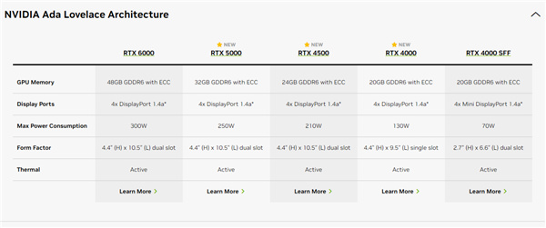 今天,NVIDIA正式发布了RTX 5000 ADA、RTX 4500 ADA、RTX 4000 ADA三款新专业卡,加上此前的旗舰级RTX 6000 ADA、半高式RTX 4000 SFF ADA,高中低端都齐了。