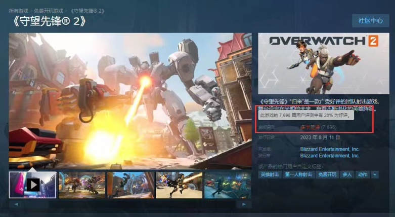 目前,《守望先锋2》已经积累了近8千个评价,其中28%的评价为好评。