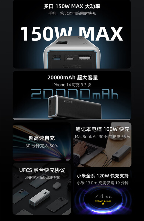 其提供有两个USB-C口和一个USB-A口,支持单口最大功率120W,提升84%。多口最大功率150W,提升138%。自充功率也提升了100%,支持90W自充,30分钟可自充50%。