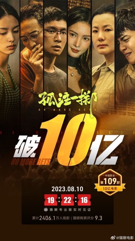 据猫眼专业版数据,电影《孤注一掷》总票房破10亿!成为中国影史第109部票房破10亿电影,连续6天单日破亿。