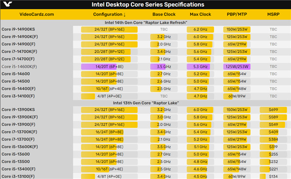 14代酷睿K/KF系列预计10月份首发,至少六款型号,65W常规版本则可能要等到明年初。