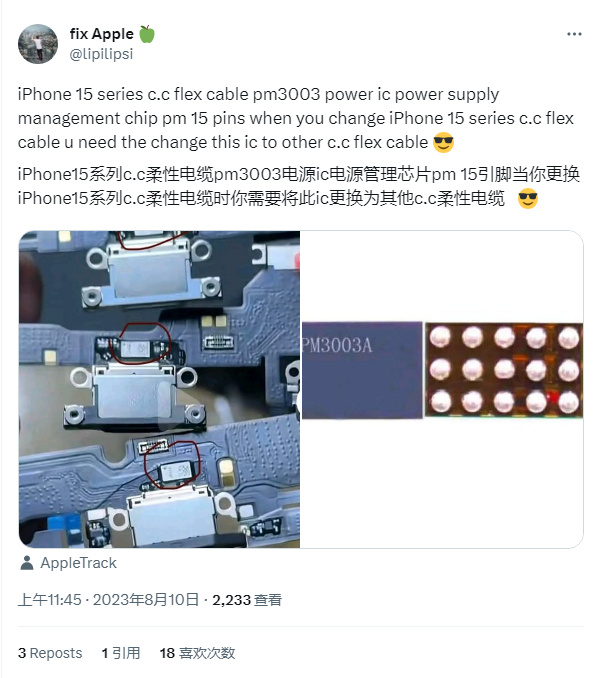 fix Apple(@lipilipsi)今天还曝光了关于 iPhone 15 USB-C 端口组件的更多信息,表示在组件上配有 pm3003 电源管理 IC 芯片,共配有 15 个针脚。根据@番茄炒西红柿反馈,pm3003 并非加密芯片,这是一颗来自高通的 PMIC,主要作用是直流电源的开关调节,华为、OPPO、BBK 平板、vivo、小米、黑鲨等手机以及部分 VR 设备都用过这款芯片。