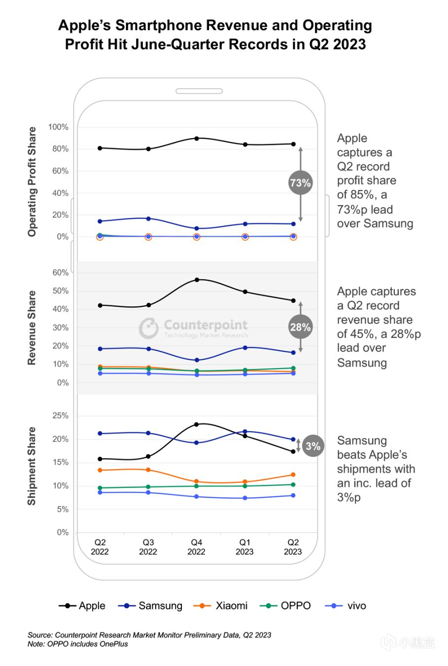 尽管整体市场下滑,苹果公司在全球智能手机市场仍然保持领先地位。今年第二季度,苹果在全球智能手机市场的收入份额达到45%,较去年同期增长近3%。值得注意的是,苹果贡献了全球85%的智能手机营业利润,创下了一个季度的记录。尽管苹果的出货量同比下降了3%,但同期全球智能手机市场下降了9%。