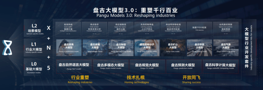 同時在大模型領域,華爲也是加緊時間佈局,推出了盤古大模型3.0,參數高達千億級別,預訓練階段使用了超過3萬億個tokens!主要面向礦山、氣象、製造業等細分toB領域,以"開箱即用"的方式爲具體行業應用或特定業務場景提供服務。