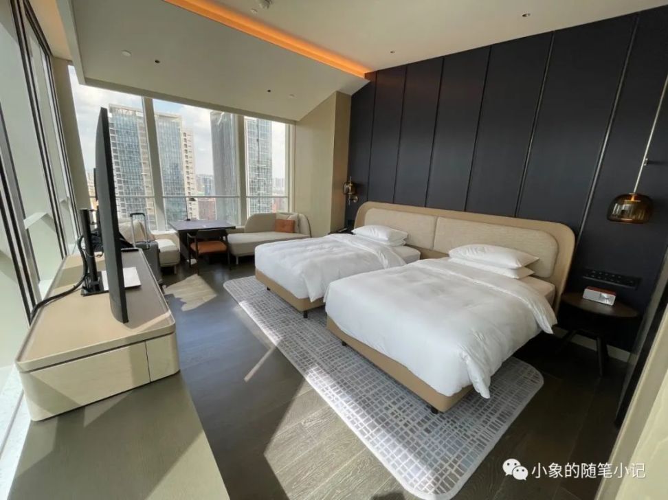 前臺把我的房間安排在22樓,雖然在整個酒店並不算太高,但風景也不錯。既然至尊房還是個角間,再加上帶着家母和舍弟不想折騰,倒也就此安頓下來。雖說至尊雙牀房整個面積標有52個平方,並不算小,但實際體感卻感覺沒有這麼大的使用面積,大概是房型狹長導致。