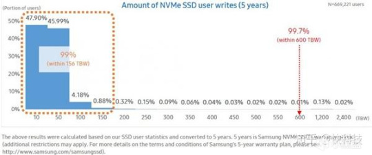 根据三星的数据,在5年质保期内,99%的玩家实际消耗的写入寿命不过156TBW,只有600TBW寿命的1/4左右,在8年内几乎不用担心寿命问题。