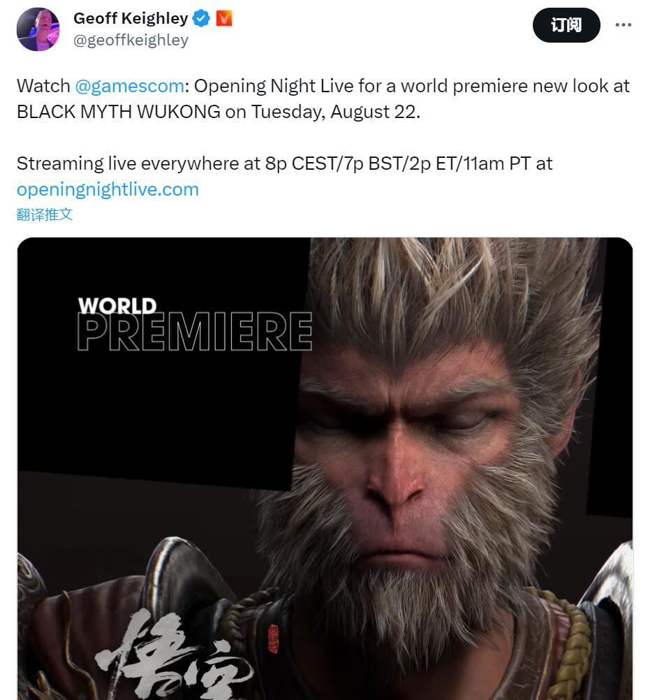 据主持人Geoff Keighley透露,《黑神话:悟空》将在科隆展前开幕夜发布全新视频。
