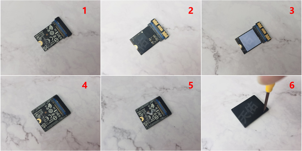 DIY安装过程的操作非常简单。首先,将固态硬盘插入转接卡,并确保插入到位。其次,揭开固态硬盘正面的标签纸,并将卡套赠送的散热硅胶片贴在固态硬盘上。接下来,将固态硬盘装入DIY CFexpress Type-B卡套,并确认它是否完全放入卡套中。然后,在固态硬盘的背面涂上适量的利民的TF7 硅脂。最后,安装CFexpress Type-B卡套的背盖,这样就完成了整个DIY过程。操作简便,无需太多复杂步骤即可完成。