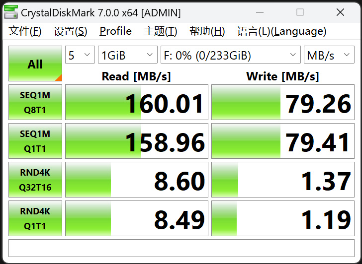 CrystalDiskMark测试顺序读取160MB/s,稍微超过标称值,顺序写入速度79MB/s。