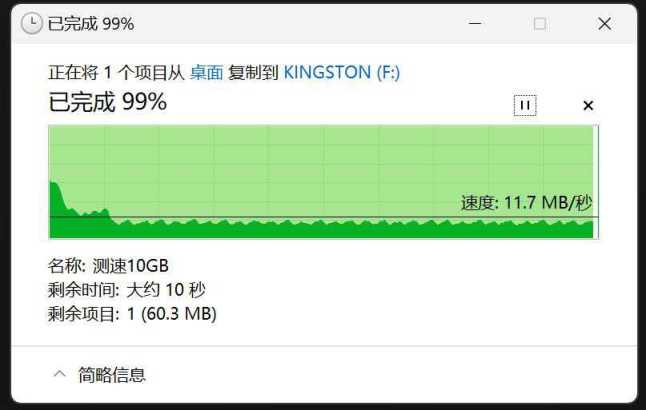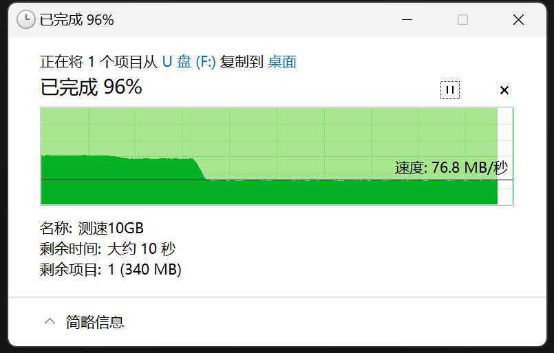 写入测试中,10GB文件只有稍纵即逝的20MB/s,之后下降到10MB/s左右稳定传输,大文件写入速度是真的太慢了,实际工作中写入也是很重要的,经常传大文件的这款不要选。