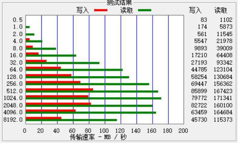 ATTO Disk Benchmark的测试结果,512MB/s以上的大文件可以到达200MB/s的读取速度,写入基本都在40MB/s以下的速度。