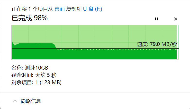 写入测试中,10GB文件在前2G-3G能到100MB/s,之后下降到79MB/s左右稳定传输。