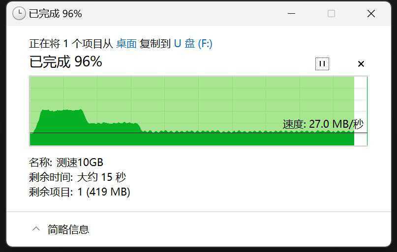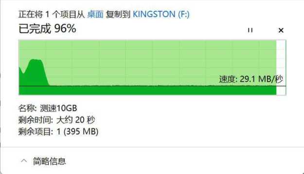 写入测试中,10GB文件在前1G左右能到90MB/s,之后下降到29MB/s左右稳定传输。