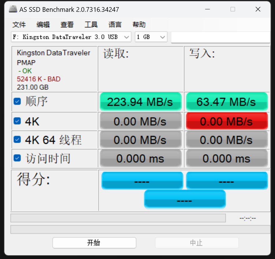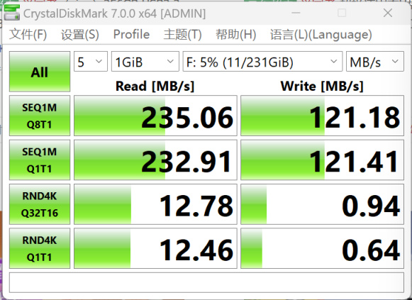 CrystalDiskMark测试顺序读取速度能到235MB/s,顺序写入速度121MB/s,读取比官方标称高。