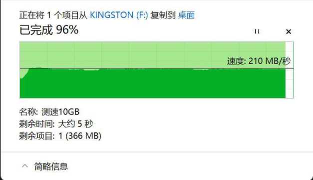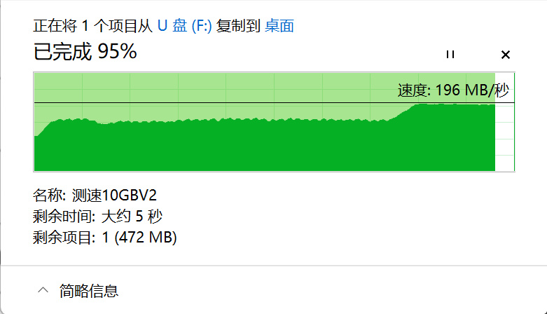 实际拷贝中,10G大文件基本在150MB/s以上的速度,最后十几秒到达196MB/s,读取速度还算稳定。