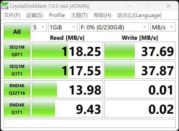 CrystalDiskMark测试顺序读取速度118MB/s,顺序写入速度37MB/s。