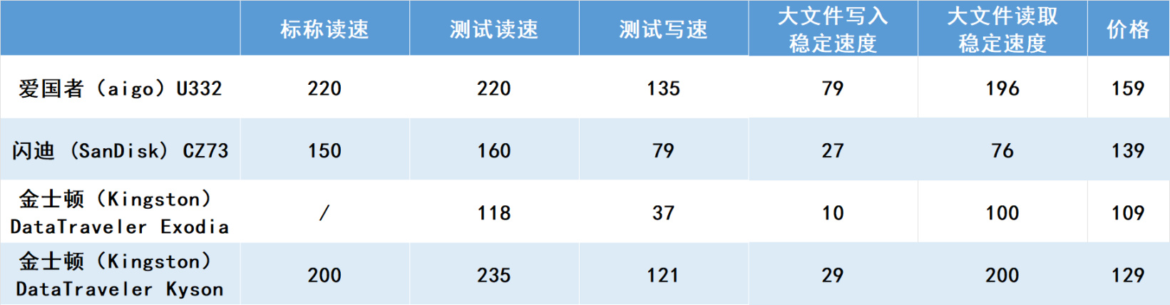 3、大文件实际读写最好的是爱国者U332,写入速度在这几款是最快的,经常读写大文件可以考虑他。
