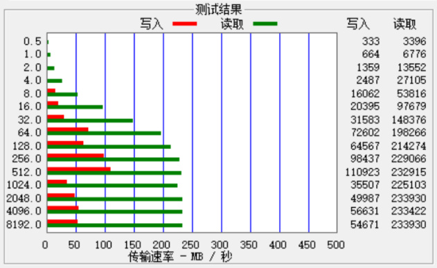 ATTO Disk Benchmark的测试结果,256MB/s以上的大文件可以到达200MB/s的读取速度,512MB以上大文件写入就可以在100MB/s的速度了。
