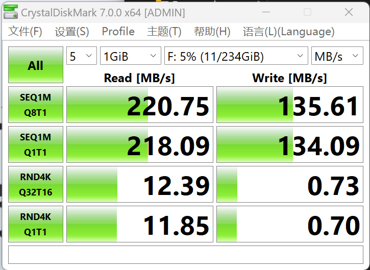 CrystalDiskMark测试顺序读取速度正好220MB/s,顺序写入速度135MB/s,读取与官方标称一致,4K读取性能一般,不过对于优盘来说这不重要。