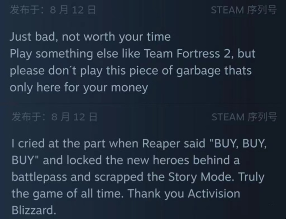 但不管怎样,暴雪一系列骚操作导致现在国内国外都被狂喷纯属自作自受。中国玩家因为之前暴雪的骚操作,直接让国内玩家花费众多心力金钱打造的账号直接数据清零,有些人几年的时间和金钱毁于一旦。而国外玩家主要针对的是游戏内的氪金机制和内购项目,比如取消故事模式、新英雄只能通过通行证获得、只为盈利的辣鸡游戏。