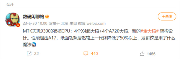 此前有爆料提到,天玑9300可以做到性能性能可以狙击苹果A17芯片,而纸面功耗甚至相较上一代还降低了50%以上。