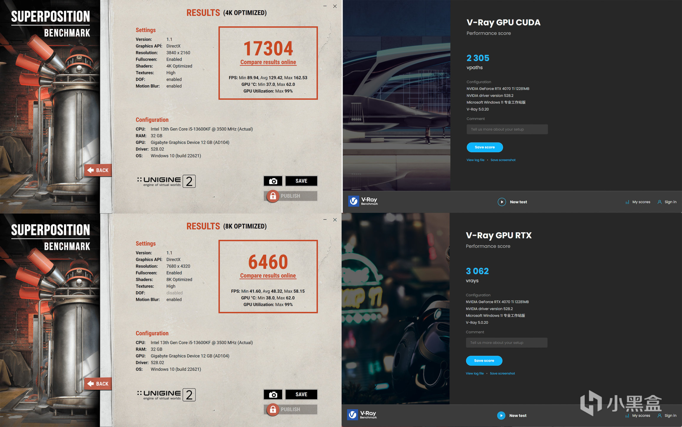 V-ray 测试成绩如图,RTX 4070Ti 显卡 V-ray GPU CUDA 2305、V-ray GPU RTX 3062;Superposition 测试4K Optimized 成绩17304、8K Optimized 成绩 6460 。