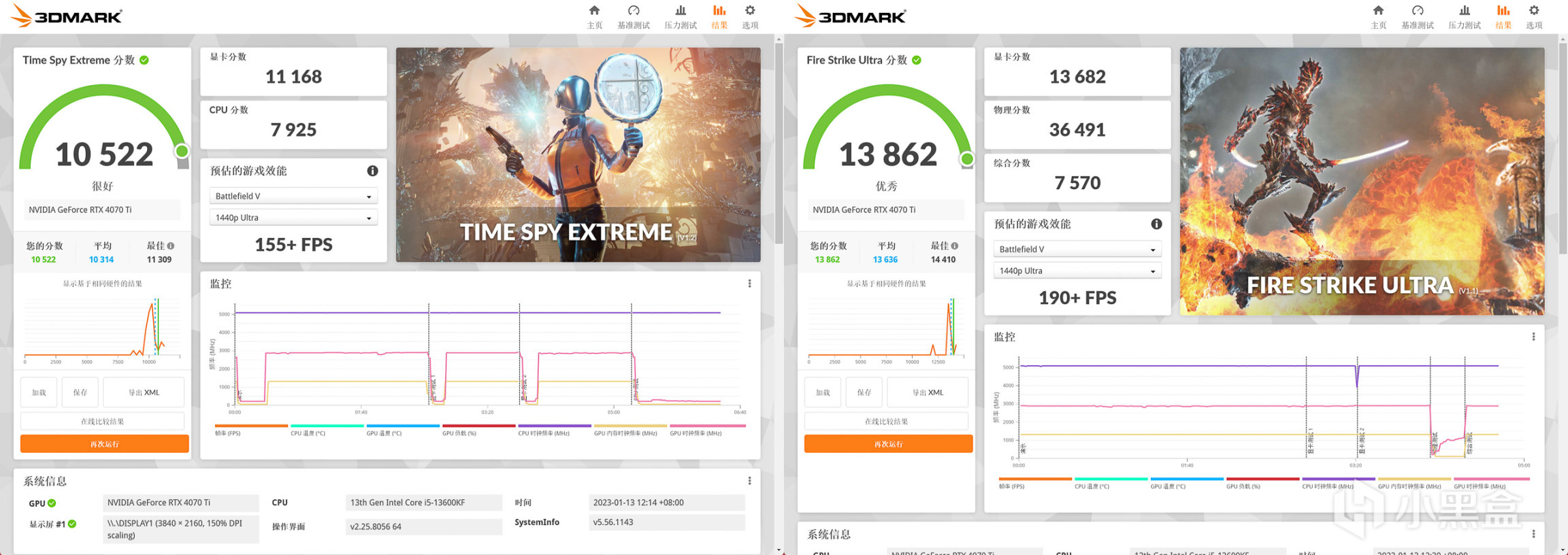 3D Mark Time Spy Extreme 得分10522,显卡分数 11168,CPU 分数 7925;Fire Strike Score 得分13862,显卡分数 13682,物理分数 36491 ;
