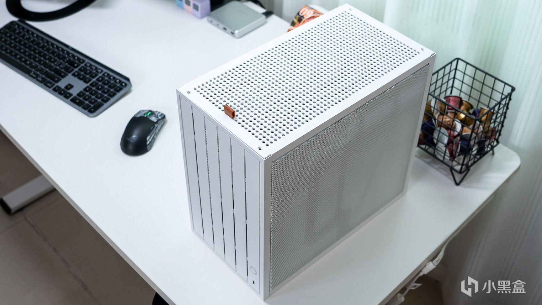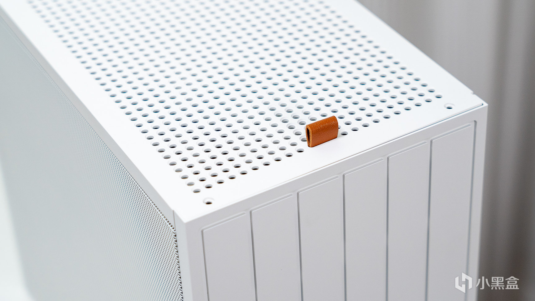 机箱顶部圆形密集散热开孔,均为 CNC 倒角处理。细节处理的甚至要比不少传统量产机箱都好。