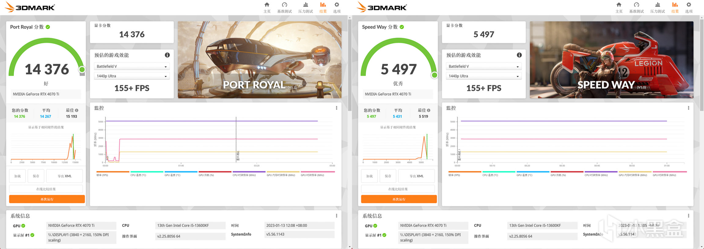 3D Mark 的索泰 RTX 4070Ti 12G X-GAMING 欧泊白显卡测试 Port Royal 光追测试得分 14376,更新的 Speed Way 分数 5497。
