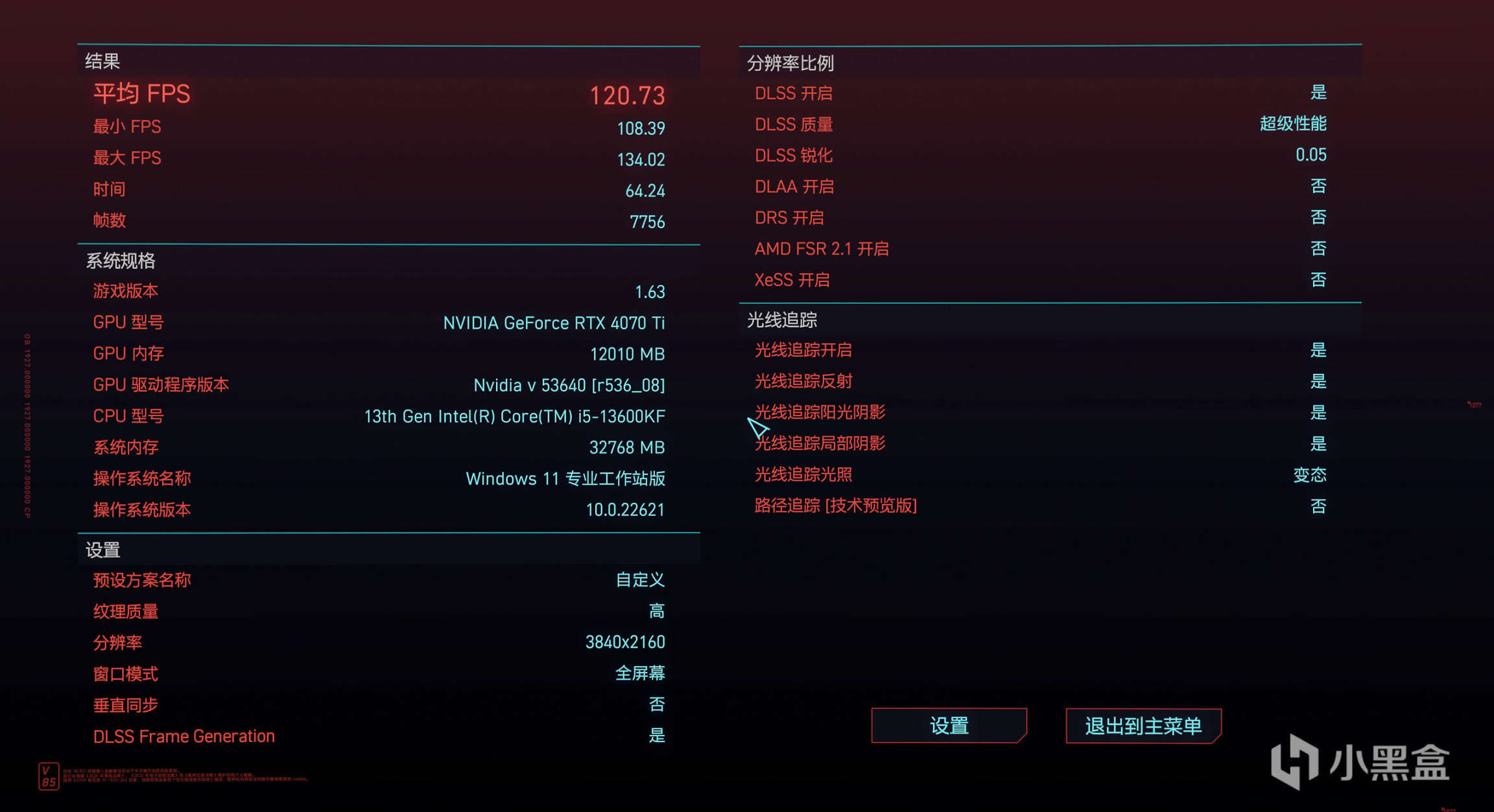 「2077」游戏测试在4K 分辨率下开启光追、DLSS 超级性能模式下平均帧数120.73 FPS,最小FPS 108.39。