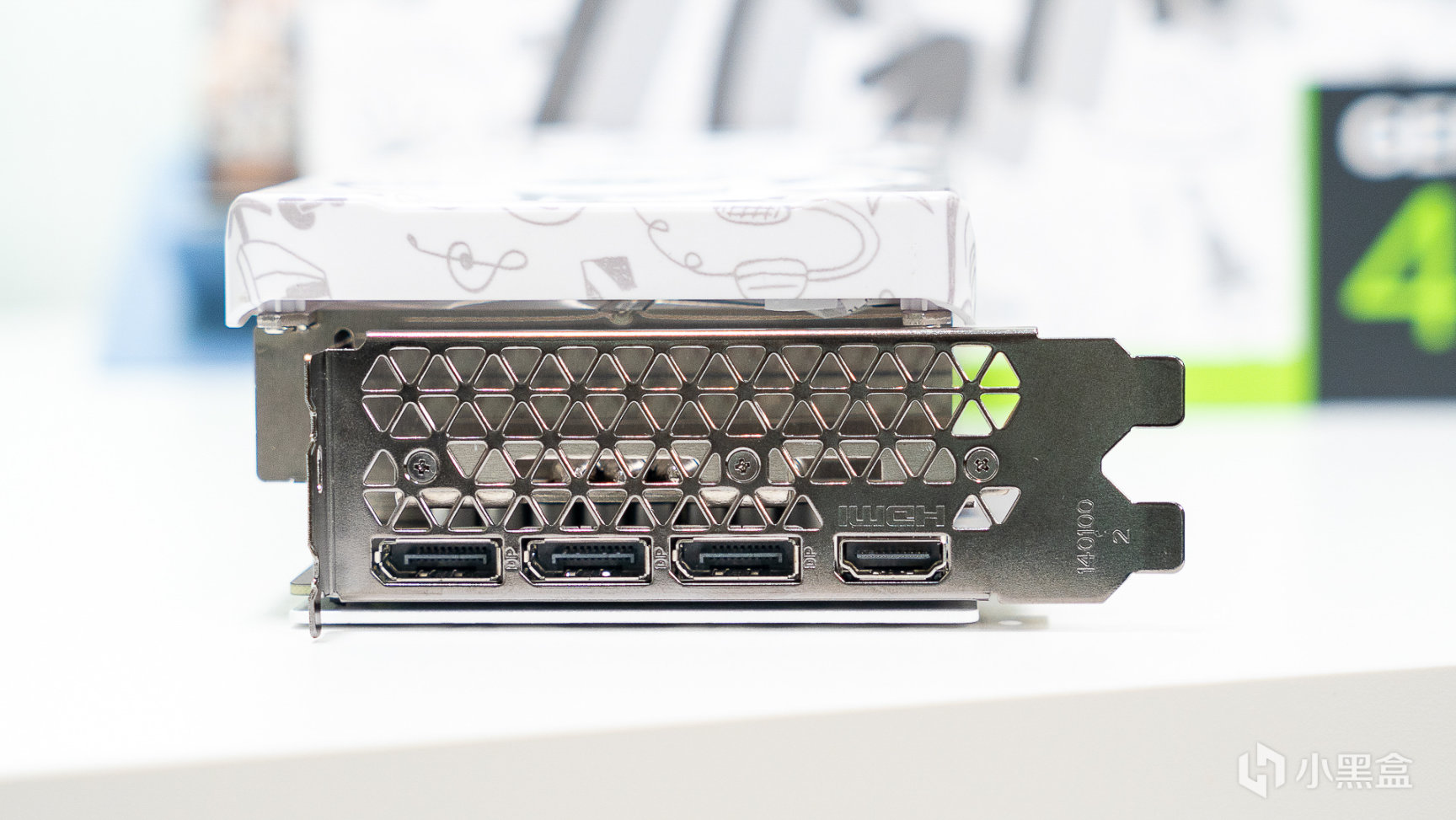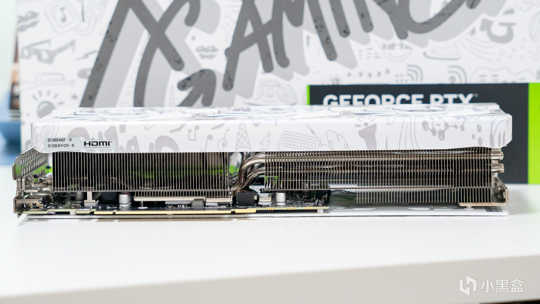 接口方面依旧是三个DP接口和一个HDMI 2.1 接口的设计,从这一侧也可以看到显卡厚度方面大概为两槽半设计。这个厚度对于机箱选择上也更友好。