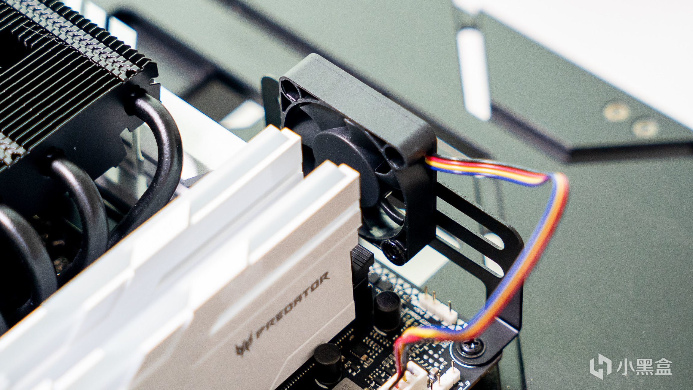另外对于日常喜欢极致超频的用户来讲,大家都会在给D5 内存超频的时候额外给内存配置一个小风扇来帮助散热。当然之前都是在想是Z790 Hero 这类高端主板上才会附带的内存风扇散热支架。这次宏碁掠夺者 Hermes冰刃系列直接为玩家提供了,而且除了支架之外,还提供了一个4cm 的定制内存风扇,别看这款风扇很小,但是依旧可以保持在29.9DB 噪音下提供4.72CFM 的风量来帮助宏碁掠夺者 Hermes冰刃系列内存散热。