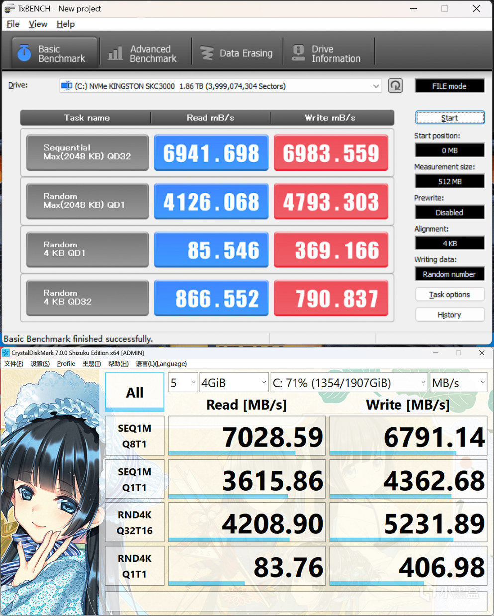 金士顿 KC3000 2TB SSD 硬盘读写测试成绩如图,双7000MB 俱乐部成员表现还是非常不错的。