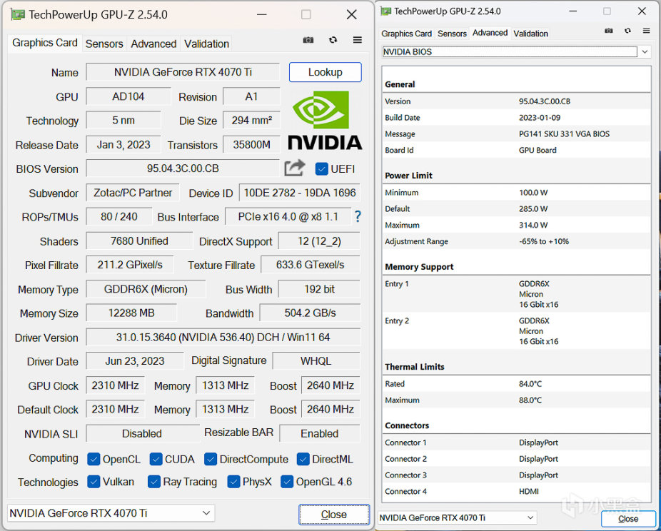 索泰 RTX 4070Ti 12G X-GAMING 欧泊白显卡通过 GPU-Z 查看显卡信息,OC 模式下末日功耗限制 285 W,可解锁至 314 W。