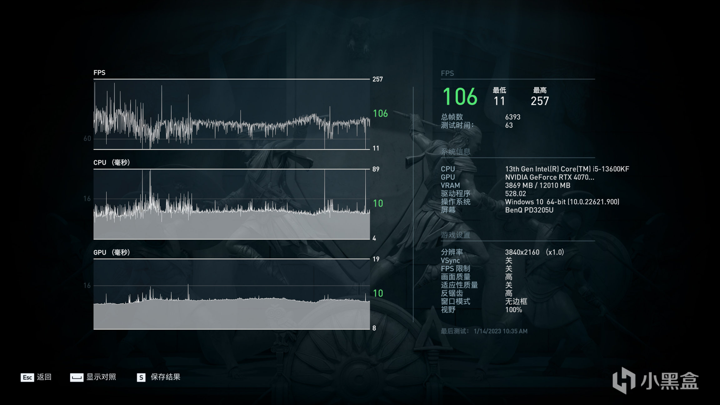 「刺客信条 奥德赛」在4K 分辨率最高画质下平均帧数 106FPS,最低帧数 11FPS 。