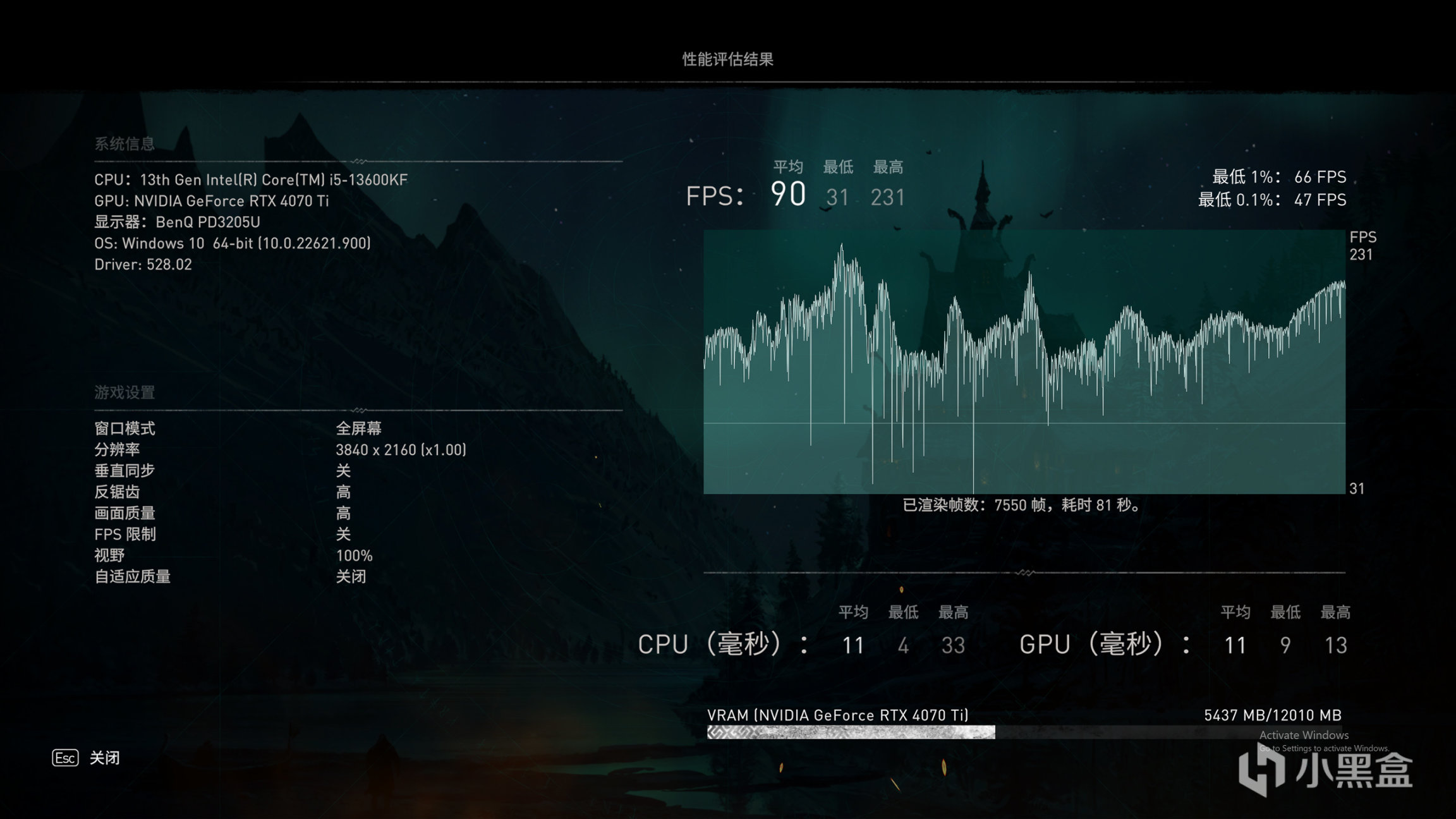「刺客信条 英灵殿」在4K 分辨率最高画质下平均帧数 90 FPS,最低帧数 31FPS 。