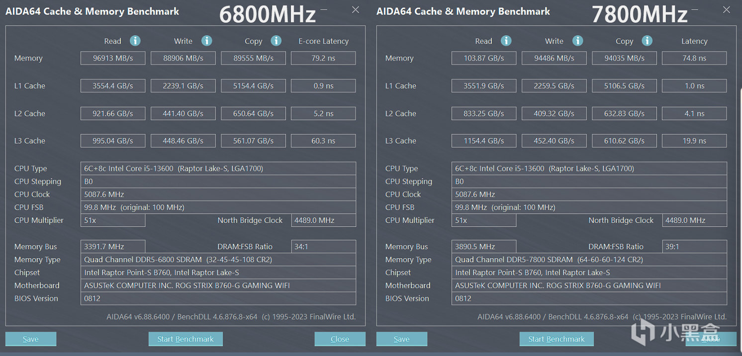 内存测试可以看到宏碁掠夺者 Hermes冰刃 6800MHz 32GB DDR5 内存在 6800MHz 频率下测试读写速度 96933MB/s、88906MB/s、89555MB/s ,延迟79.2ns。手动超频至 7800MHz 后测试读写速度 103.87GB/s、94486MB/s、94035MB/s ,延迟74.8ns。可见宏碁掠夺者 Hermes冰刃内存特挑的海力士的颗粒还是具有不错的超频空间的,后续有时间我再详细调整一下时序与电压应该也会有更好的成绩。