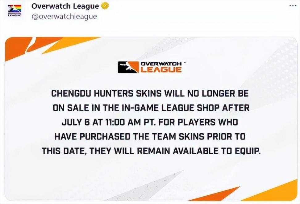 之后在成都猎人队宣布彻底退出守望先锋全球联赛时,暴雪不光没有冷处理,反而火上浇油,它搞了一个公告“欢送”中国战队退出联赛,并号召玩家们尽快入手成都猎人队的皮肤,不买就要绝版了(国服都没了买个锤子)