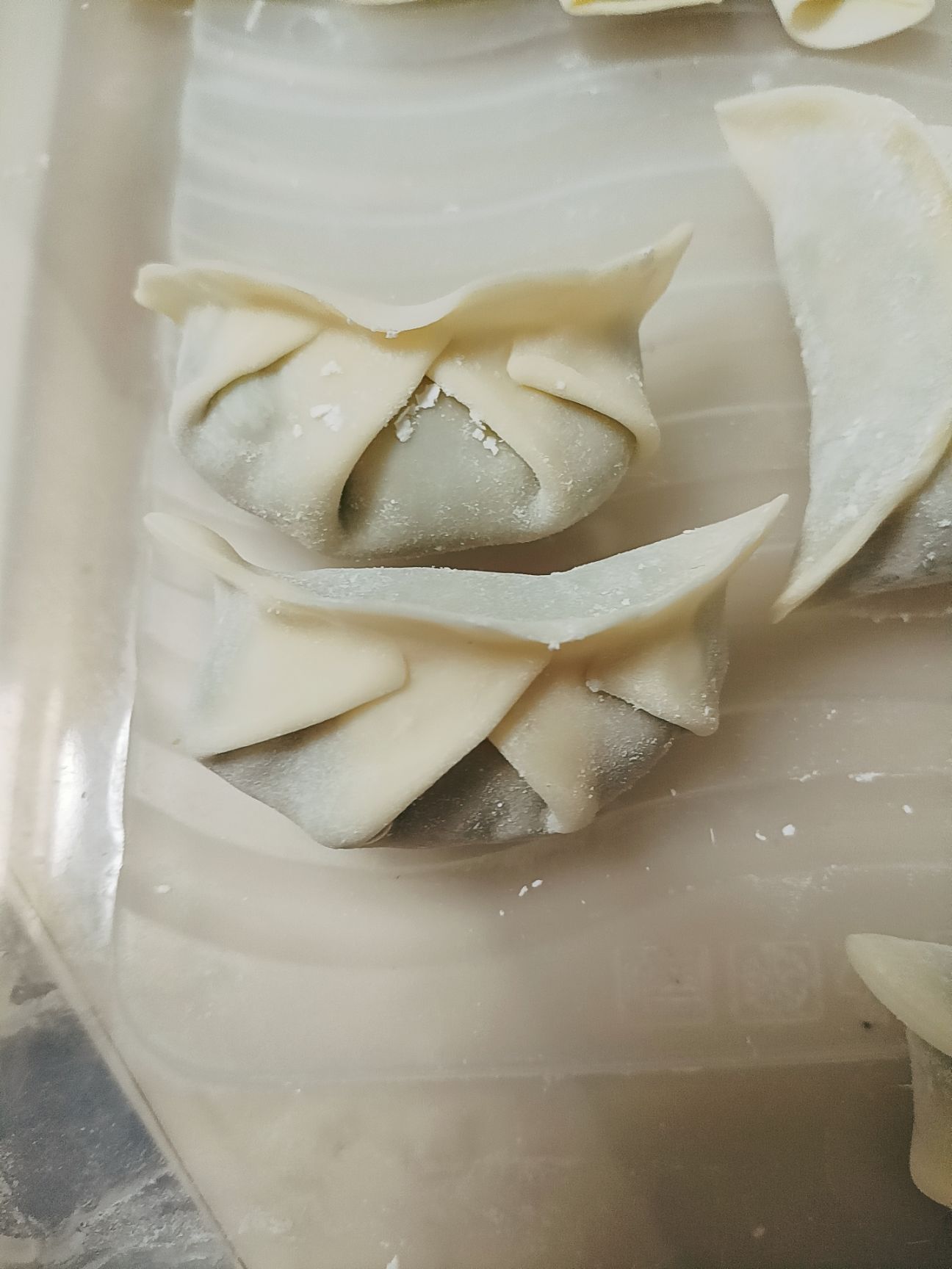 我只会最简单包法。馅让中间,饺子皮一边抹点水,中间对齐,两边都留一点点,再折起来。【我手真不巧】