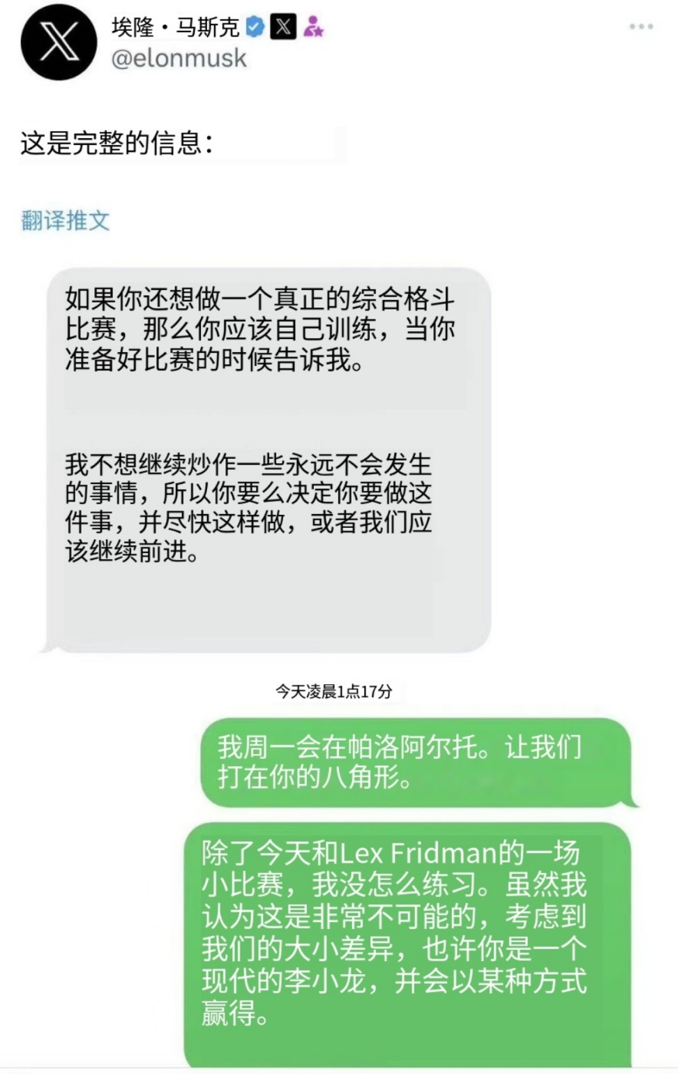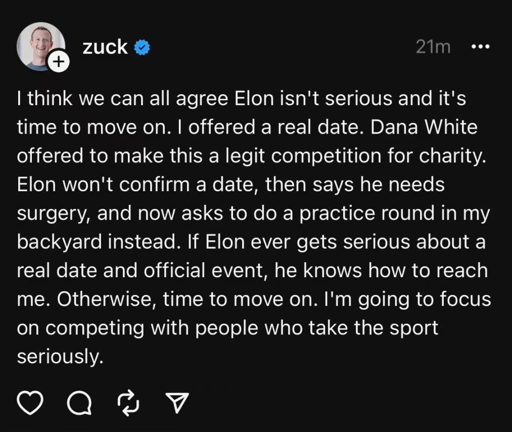 在马斯克与扎克伯格的“约架”成功后不久,扎克伯格发表了一篇文章回应此事。他表示认为马斯克根本没有认真对待这个约定,尽管我给出了日期,但他并没有答应,并称自己需要手术。而现在他又说要来我家进行一场练习赛。如果马斯克真的认真对待这件事,他应该知道如何联系我。算了,我们还是就此放弃吧。我将把注意力集中在那些真正严肃对待比赛的人身上。