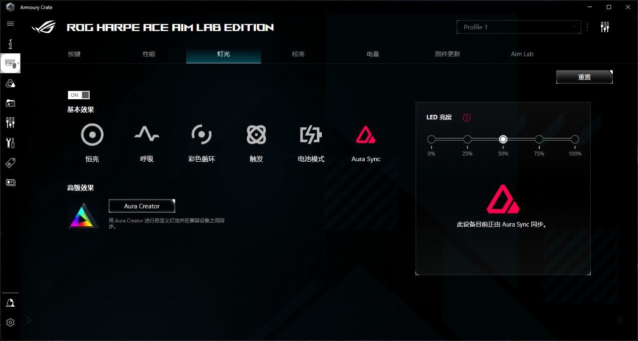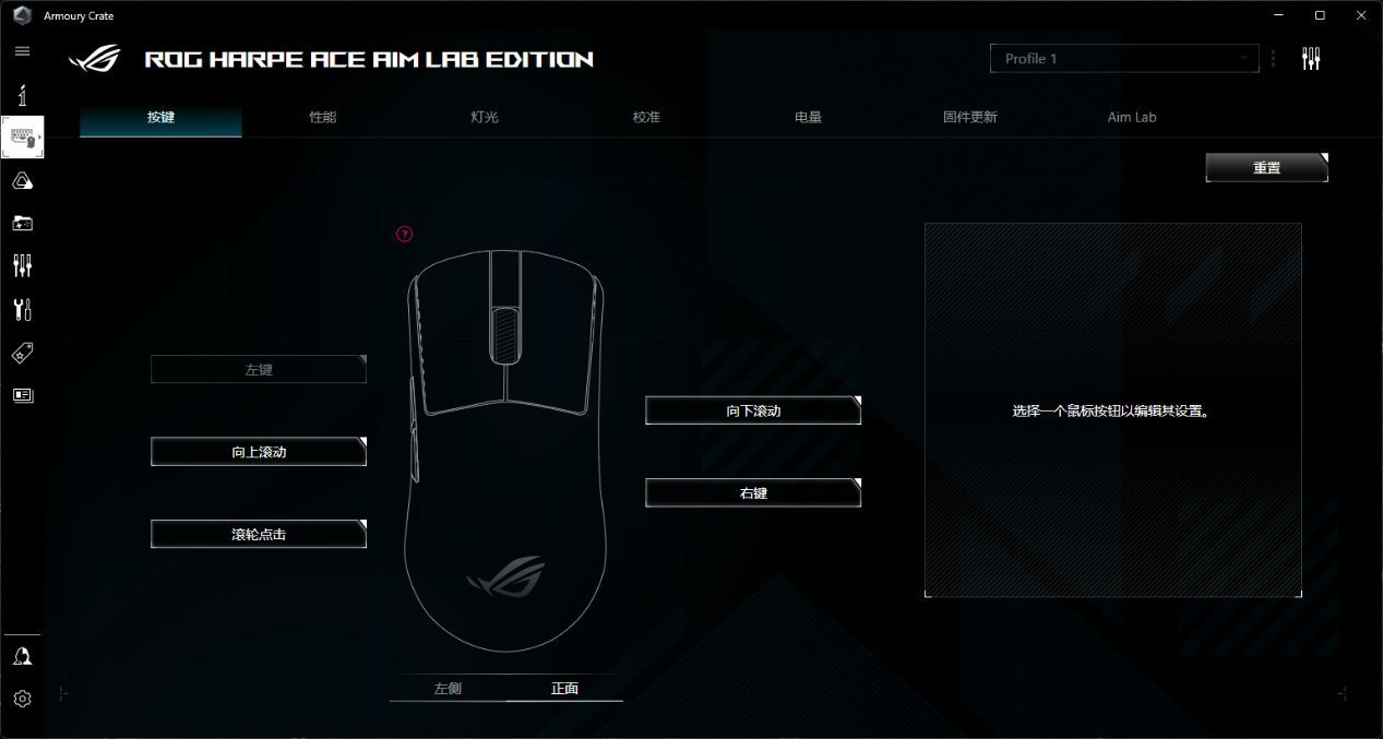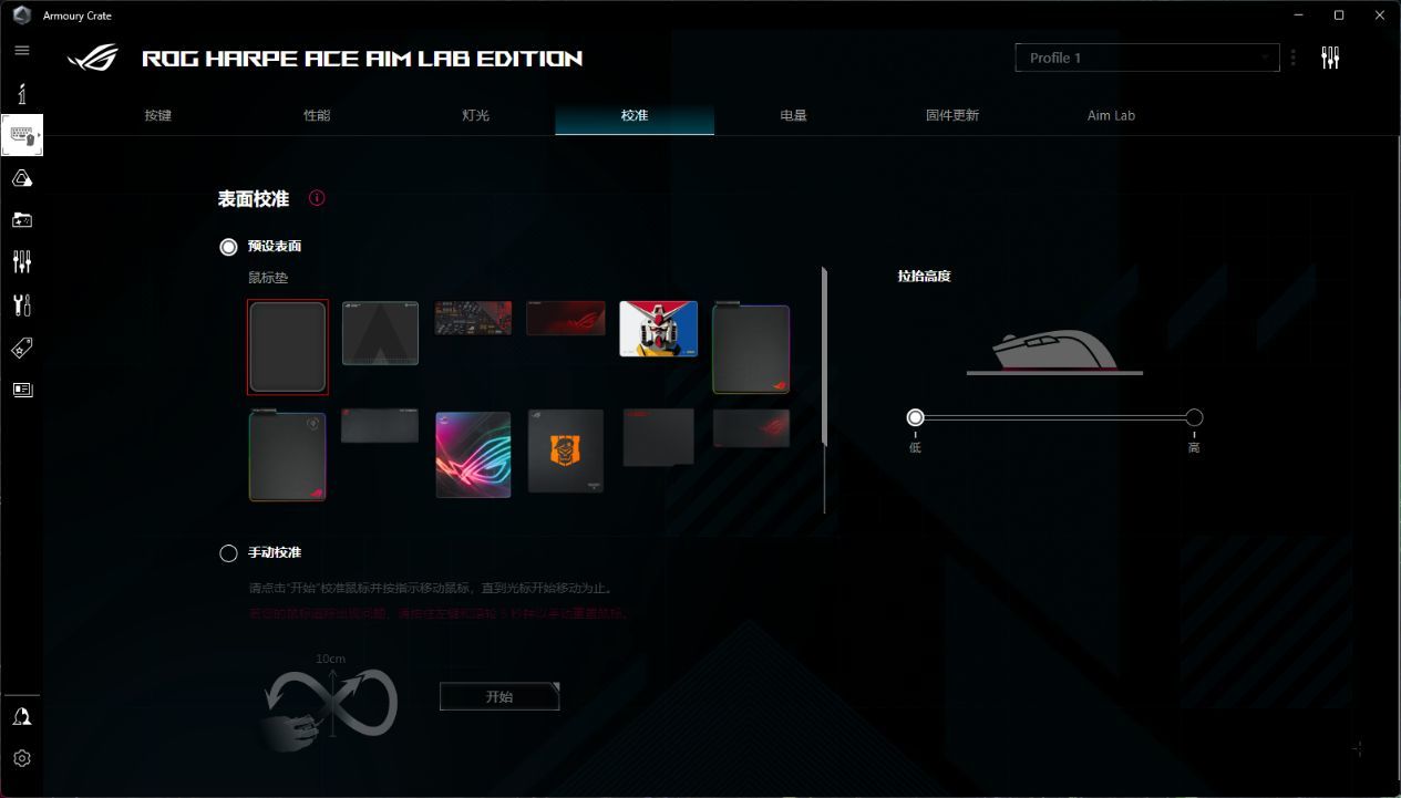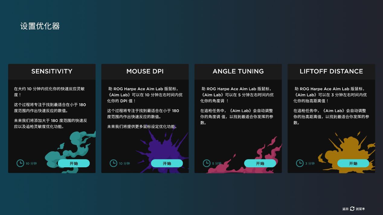 打开AimLab软件并插上ROG龙鳞ACE后即可在软件中的设置优化器解锁鼠标专属的调教选项,包括DPI、角度值以及静默高度等,只需要全程紧随软件进行测试操作即可试验出最适合自己的参数设定。不过值得一提的是在使用AimLab测试前记得去奥创把龙鳞ACE的AURA灯光同步关闭,不然软件无法识别出鼠标进而会导致开始按钮无法按下。