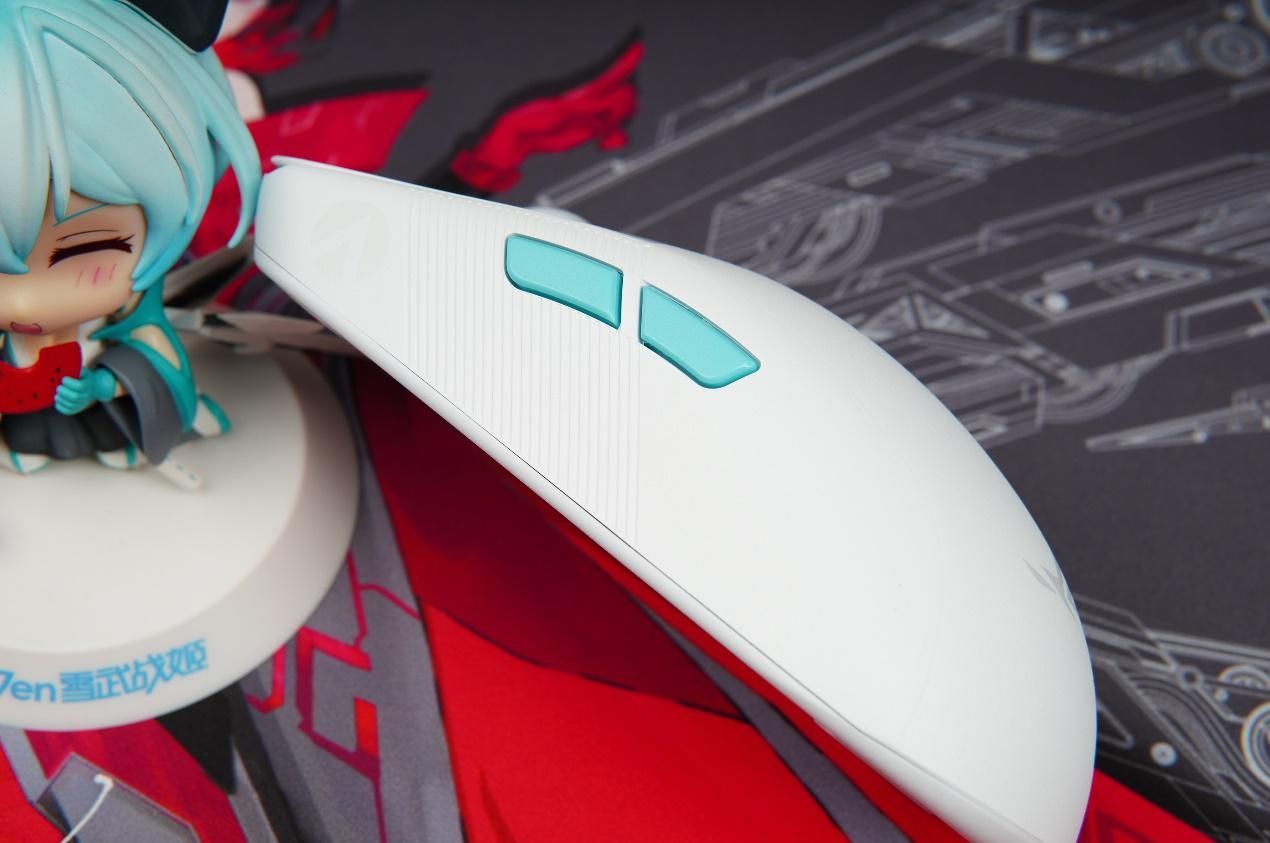 鼠标侧面设防滑的斜纹,拥有两个冰蓝色的侧键,手感尚可,属于标准侧键手感,确认感清晰,按键需要一定力度才能触发,误触情况基本不会发生。