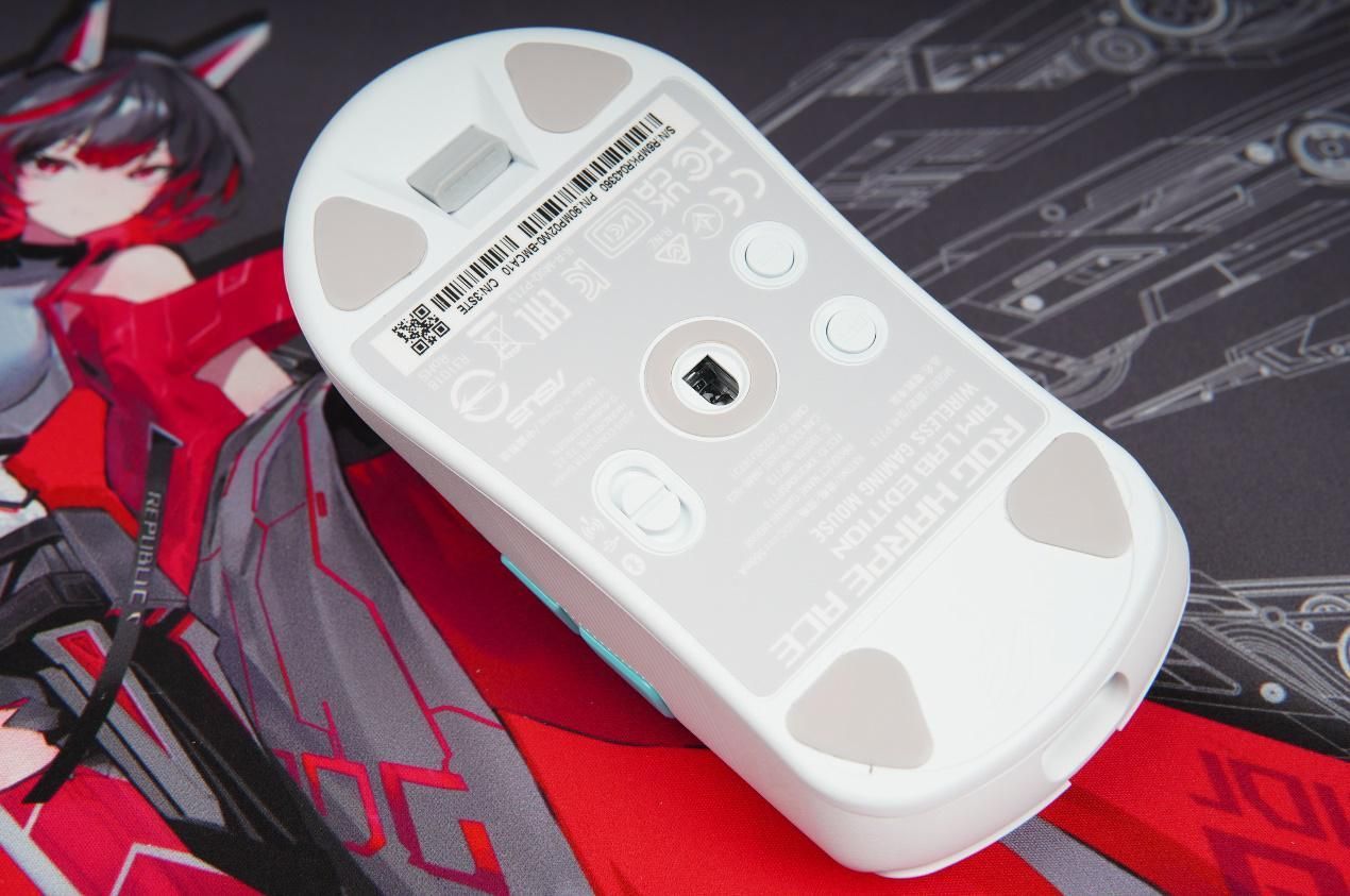 鼠标的底部看起来要“花里胡哨”不少。ROG龙鳞ACE采用的是AimPonint36K传感器,最高36000DPI,650IPS,50G的加速度,其实这个级别的光学引擎其实也没啥好说的,性能各方面都是顶级存在的,就一个字总结:准。