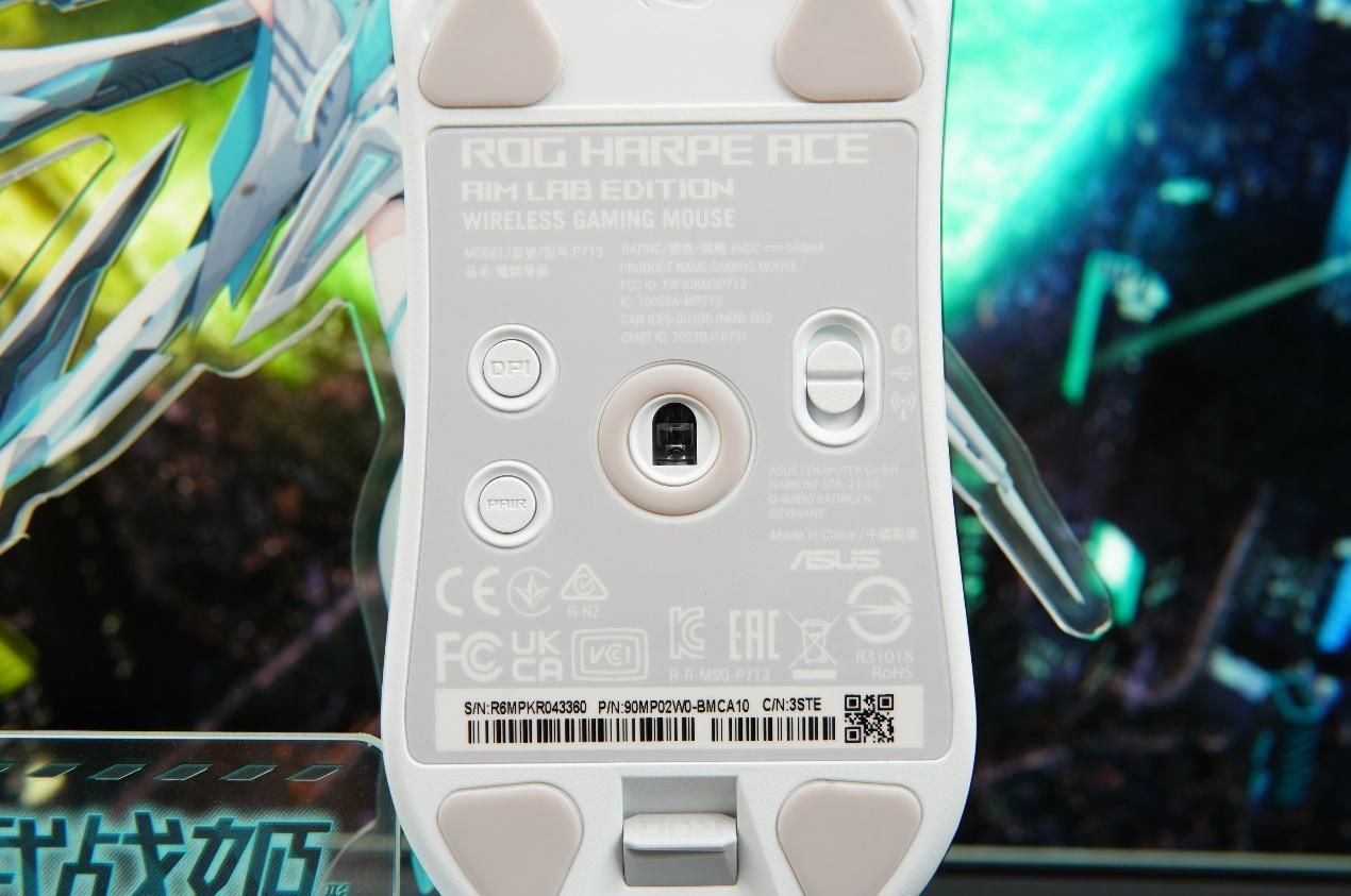 ROG龙鳞ACE拥有3种连接方式,2.4G、有线以及蓝牙,可以通过底部的开关进行选择。此外还有一颗DPI档位切换开关以及PAIR配对按键。