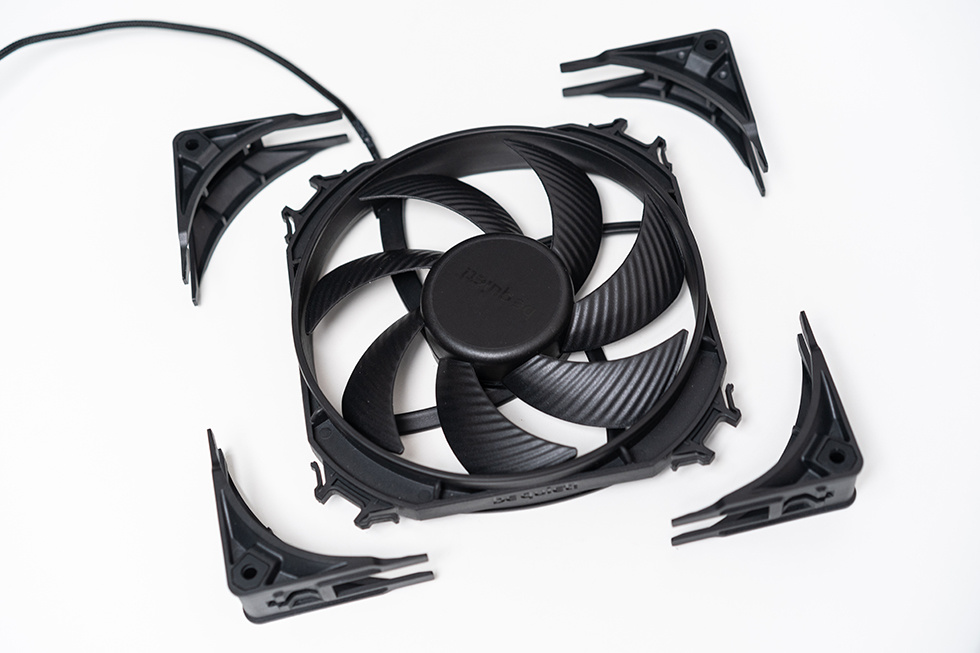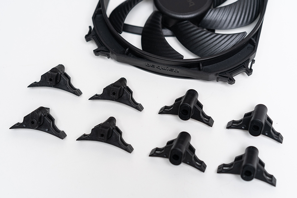 Silent Wings Pro 4 提供3种支架安装。预装的水冷散热角支架经过特别设计,能让水冷散热器在这款高端风扇上具有亮眼表现。附送了常规减震支架和硅胶减震支架,根据不同使用场景来选择不同的支架。
