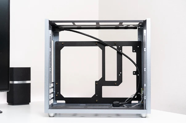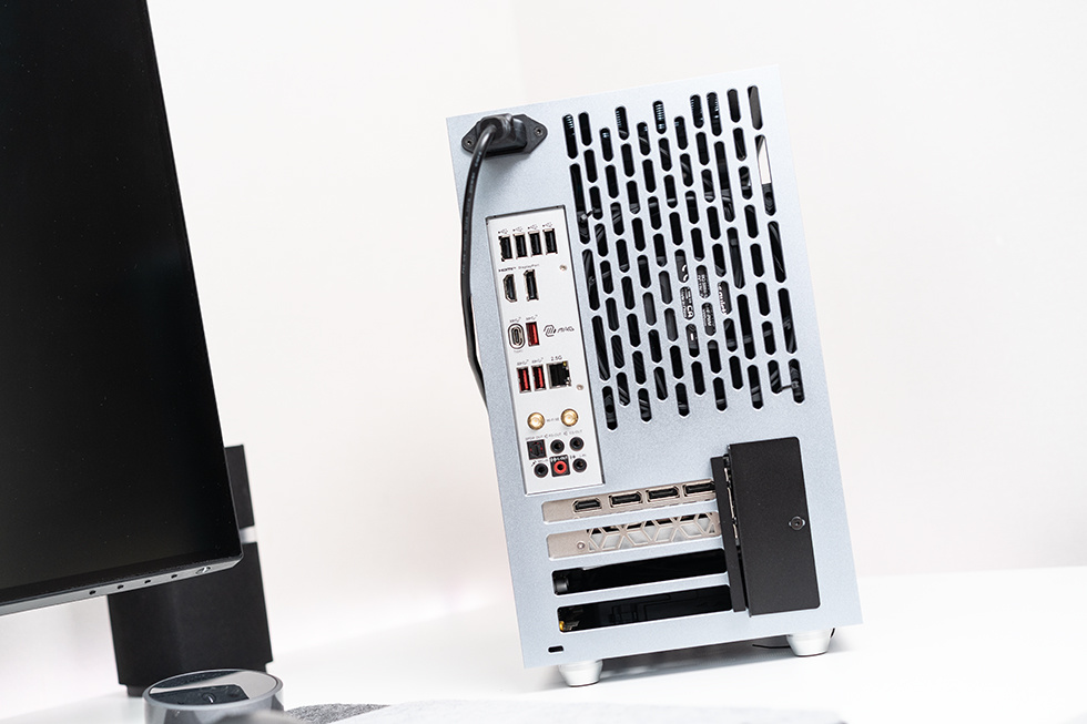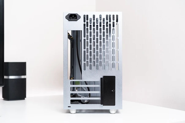 机箱尾部,左侧的电源延长线接口位于 I/O 挡板安装位上方,右侧支持1颗 12cm风扇安装,下方是显卡安装槽位,最大支持厚度为4槽位的显卡安装。